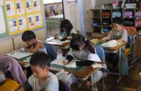 2年生が図工でカッターナイフの学習をしました。安全に楽しく制作できるように、カッターナイフの正しい使い方を練習しました。直線や波線、窓の形などたくさん練習できました。
